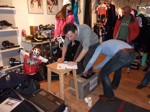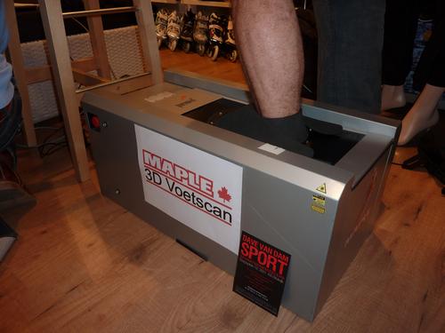 contact met Maple wordt duidelijk welke dealers klanten kunnen voorzien in het maatwerkconcept. Op afspraak bij de dealer kan je een moderne 3D scan van je voeten af laten nemen. De meeste maatwerkschoenen zijn gebaseerd op een gipsen voetafdruk. Maple pakt dit met een moderne 3D voetscan aan. Speciaal voor deze scan kwam Gerjan Woelders van Maple met zijn scanner naar Dave van Dam Sport in Stolwijk. De scanner is een grote box waar je met je voet in gaat. Het proces van de voetscan lijkt heel simpel. De voet wordt rondom gescand en op de monitor verschijnt een mooie 3D afbeelding van je eigen voet. Achter de schermen wordt van de 3D scan met CNC-techniek een zeer nauwkeurige houten mal gefreesd. De maatwerkschoen wordt vervolgens in carbon rond de houten mal gemaakt.